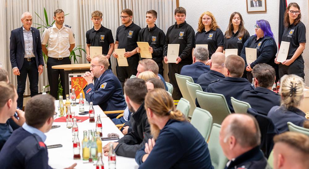 Im Flammersfelder Rathaus nahmen Bürgermeister Fred Jüngerich, der Verbandsgemeinde Wehrleiter Björn Stürz, Brand-und Katastrophenschutzinspekteur (BKI) Ralf Schwarzbach und Volker Hain, Vorsitzender des Kreisfeuerwehrverbandes Ehrungen und Ernennungen vor.